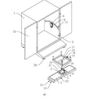 參照圖1,包括殼體1、工作臺(tái)2、盛液盒3和標(biāo)準(zhǔn)板4,殼體1內(nèi)設(shè)置有工作腔5,殼體1底部設(shè)置有多個(gè)支撐腳20,在本申請實(shí)施例中,支撐腳20設(shè)置為四個(gè),四個(gè)支撐腳20設(shè)置于殼體1的四角位置;殼體1上鉸接有兩轉(zhuǎn)動(dòng)門22;工作臺(tái)2設(shè)置于工作腔5內(nèi),工作臺(tái)2上開設(shè)有與盛液盒3適配的放置槽21,盛液盒3可放置于放置槽21中,標(biāo)準(zhǔn)板4設(shè)置于盛液盒3上方,標(biāo)準(zhǔn)板4通過升降結(jié)構(gòu)可升降連接于殼體1上,工作臺(tái)2上固定連接有水平儀6,在本申請實(shí)施例中水平儀6選用氣泡式水平儀,也可選擇其他體積較小的水平儀;工作臺(tái)2和殼體1之間設(shè)置有用于調(diào)平工作臺(tái)2的調(diào)平結(jié)構(gòu)。