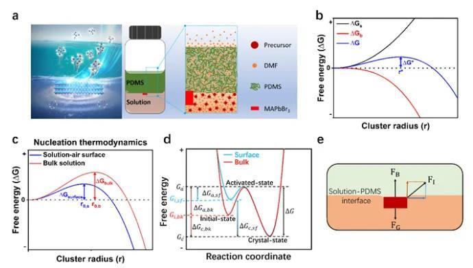 圖1. MAPbBr3鈣鈦礦結(jié)晶與晶體生長(zhǎng)。(a) PDMS輔助結(jié)晶原理圖;(b) 形核半徑與自由能的關(guān)系;(c) 溶液的表面和內(nèi)部的形核半徑的比較;(d)生長(zhǎng)過程中自由能變化圖解;(e)界面懸浮生長(zhǎng)的力學(xué)圖解。