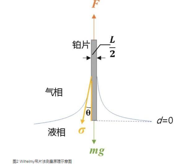 Wilhelmy吊片法測定液氣界面張力是基于垂直懸浮在界面中的鉑片上的拉力、表面張力、重力和浮力之間的平衡作用(如圖2所示):