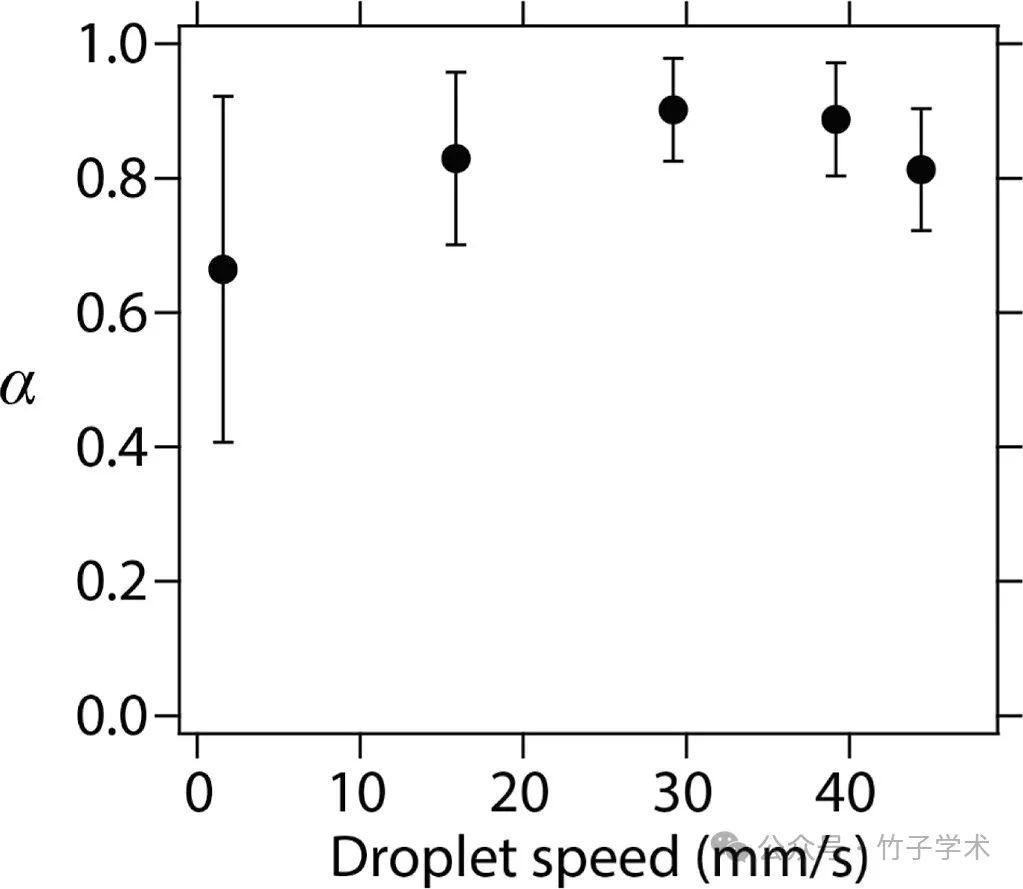 圖2(a,b)液滴速度、平衡界面張力(空氣/液體)和初始BS濃度之間的關系。(c)結果(a,b)中液滴速度與平衡界面張力(空氣/液體)之間的關系。
