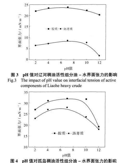 在同一系列組分中,膠質的硫、氧、氮含量低,酸性基團少,但芳香共扼結構也少,酸性基團參與反應的機率相對要高,而瀝青質硫、氧、氮含量高,酸性基團多,但芳香共扼結構多,空間阻滯作用強,酸性基團參與反應的機率相對要低,總體上表現為pH值對瀝青質的油-水界面張力的影響大于對膠質的影響。