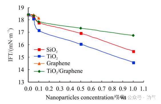 5.單獨的石墨烯納米顆粒對降低油水界面張力的影響可以忽略不計。加之其與TiO2納米顆粒(純TiO2納米顆粒)合成TiO2/石墨烯納米復合材料時,不利于發揮作用。因此,石墨烯納米顆粒對EOR來說在操作上和經濟上都不可行。