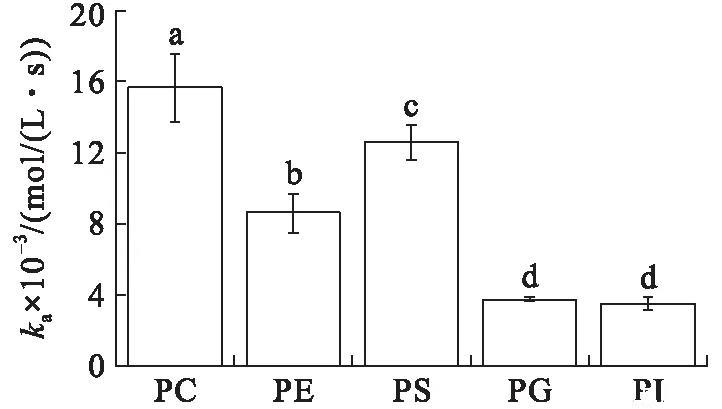 在初始表面壓力為25 mN/m的條件下(見圖4),VhPLD對PC的吸附常數最大((1.46±0.10)×104mol/(L·s)),對于PG((3.58±0.31)×103mol/(L·s))和PI((4.30±0.34)×103mol/(L·s))的吸附常數最小。在該初始表面壓力條件下,VhPLD對于PC、PE和PS的解離常數之間不存在顯著差異(P>0.05),該結果與在15 mN/m所測定的結果保持一致。而在該條件下獲得的VhPLD對不同磷脂單分子層吸附偏好性順序為PC>PS>PI>PE=PG。