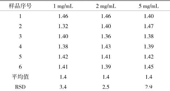 在150℃加熱10 min的測定條件下,采用滴定度為1 mg/mL的費休氏試劑,用卡氏干燥爐自動進樣法測定樣品中水分含量,樣品測定6次,計算6次結果的相對標準偏差(RSD%)數據見表5。結果表明測定結果具有良好的重復性。