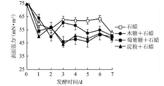 分別在不同碳源(石蠟2 g/L、木糖2 g/L+石蠟2 g/L、葡萄糖2 g/L+石蠟2 g/L、淀粉2 g/L+石蠟2 g/L)的發酵培養基接入5%液體種子,60℃靜置培養7 d。每天定時取樣測定發酵液的菌體密度(OD600nm值),上清液的表面張力、乳化活性及石蠟的含量。