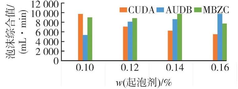 泡沫性能直接關系到起泡劑在地層的封堵效果。目前,油田驅油用表面活性劑工業品主要有陰離子型、非離子型和兩性型單獨或復配使用,其泡沫性能差別很大。起泡劑的濃度是影響起泡劑活性的重要因素之一,合理的濃度設置必須使其既具有高效的泡沫特性也具有一定的經濟性,故選擇CUDA、AUDB、MBZC這3種非離子-陰離子型起泡劑,在其質量分數分別為0.10%、0.12%、0.14%和0.16%時,評價這3種起泡劑發泡量、半衰期、泡沫綜合指數等性能。