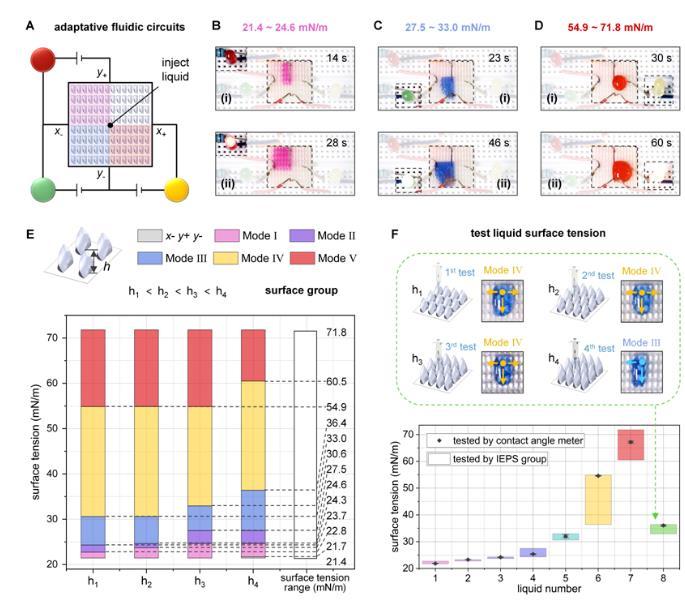 為實現多向調控液體,香港理工大學王立秋教授團隊提出了由陣列式三維不對稱尖牙結構單元組成的結構化表面,為不同表面張力液體定制運輸方向,并呈現出五種新穎的運輸模式(圖1)。這種智能調控液體的能力源于所設計表面單元自下而上分布的多曲率特征,在三維空間上交替地主導液體表面的局部拉普拉斯壓差,從而原位控制不同潤濕性液體的多樣定向運輸模式。該表面根據液體特性實施多模式控制的能力使其具備傳統結構化表面難以實現的創新功能,如構建自適應液體電路、便攜式表面張力指示器、智能調控液體及按需熱管理。該研究以“In Situ Multi-Directional Liquid Manipulation Enabled by 3D Asymmetric Fang-Structured Surface”為題發表于《Advanced Materials》,團隊博士生孫思琦為論文第一作者,王立秋講席教授為通訊作者,張藝媛研究助理教授為共同通訊作者。