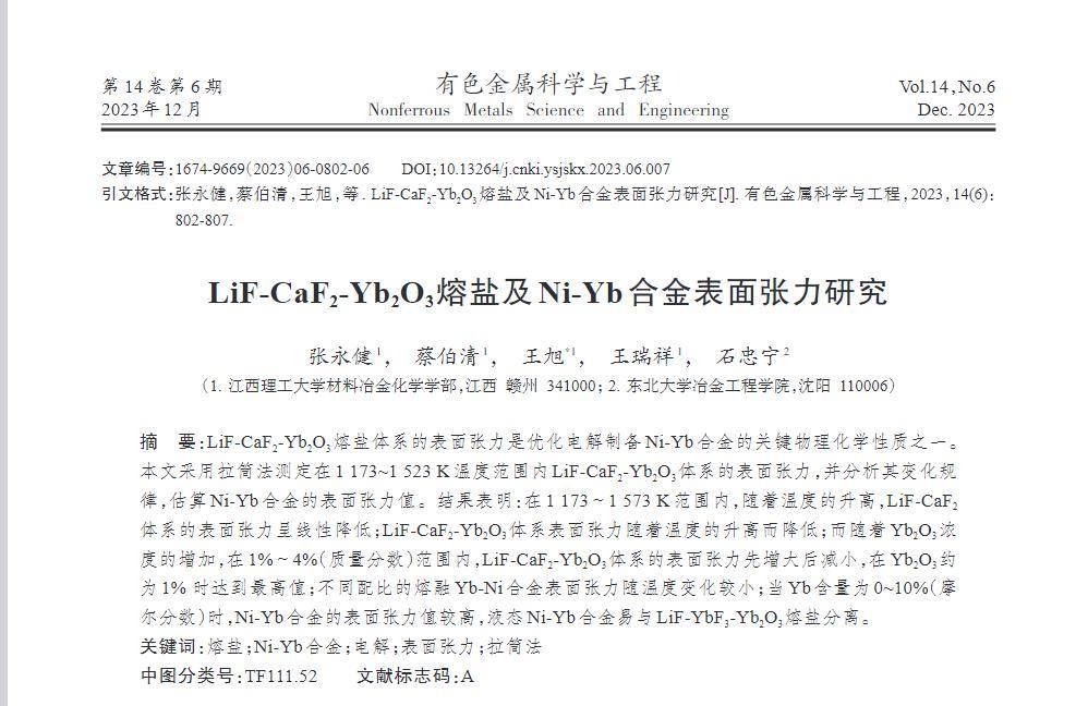 > LiF-CaF?-Yb?O?熔鹽體系表面張力的測定及其對Ni-Yb合金電解的指導意義(二)
