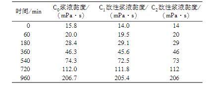 3.1表面活性劑對漿液黏度時變性的影響研究3種漿液在23℃條件下黏度隨時間變化關系見表2。可以看出:3種漿液的黏度均隨時間的增長而逐漸變大,表面活性劑對漿液的初始黏度以及不同時間的黏度影響很小(最大變化≤1.8mPa