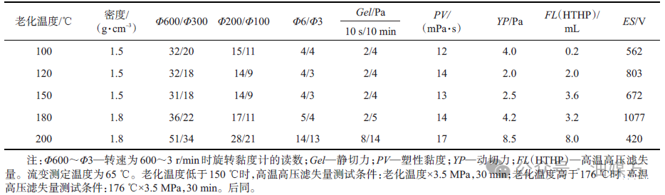利用重晶石對鉆井液的密度進行調節,評價不同密度條件下體系的綜合性能,結果見表3。由表3可見,構建的環保非水基鉆井液在120~180℃范圍內具有較好的穩定性,密度為1.8g/cm3時,鉆井液體系破乳電壓在1000V以上,體系具有良好的流變性及高溫高壓濾失量。但是當老化溫度高于200℃后,鉆井液的黏度明顯增加,高溫高壓濾失量變大。這可能是因為BIO-EMUL與BIO-COAT屬于脂肪酸及其酯類衍生物表面活性劑,高溫造成了表面活性劑的降解及油/水界面的解吸附。