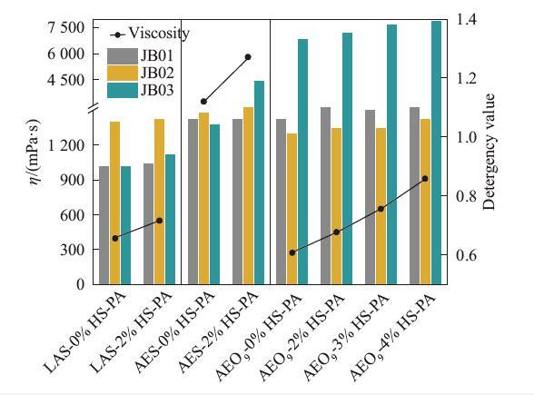 HS-PA作為高分子表面活性劑,不僅具有高分子的增稠性能,還有一定表面活性。為確保與空白組的總表面活性劑質量分數一致,在加入HS-PA的同時,其他表面活性劑的添加量將相應地減少(具體如表1所示)。表1中不同配方洗滌劑的去污力如圖4中的柱狀圖所示,不論有無HS-PA,不同表面活性劑體系的去污力有顯著區別:LAS為主表面活性劑的體系整體去污力最差,JB01炭黑和JB03皮脂污布的去污力未達到標準洗滌劑;其次為AES體系,在3種污布上的去污力均超過標準洗滌劑;AEO9的JB01和JB02去污力與AES體系接近,但它的皮脂去污力優于AES體系。當在不同體系的洗滌劑中復配HS-PA后,配方的JB01和JB02去污力無明顯變化,但JB03的去污效果均有提高,說明了HS-PA有利于提高在皮脂污布上的去污力。這可能是由于高分子表面活性劑通常具有良好的乳化性能,其疏水鏈可深入疏水粒子,親水鏈進入水溶液中,而它的高分子量具有較大空間位阻效應,使得分散狀態下的疏水粒子無法緊密相連,達到穩定乳化的效果。皮脂作為油溶性污漬,經過乳化后更易于被去除。從以上結果可知,在不同配方中加入HS-PA高分子表面活性劑不僅可以提高黏度,甚至還能提升在JB03上的去污力。