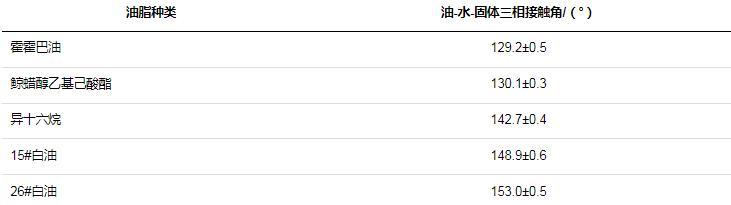 以不同極性的油脂為油相制備了一系列的Pickering乳液,圖2是不同油脂得到的W/O型Pickering乳液的表觀照片、微觀圖像及粒徑分布圖,可以看出,不同油脂得到的Pickering乳液粒徑具有較大的差異,粒徑大小順序為霍霍巴油(5.45μm)<鯨蠟醇乙基己酸酯(8.66μm)<異十六烷(17.46μm)<15#白油(18.20μm)<26#白油(24.53μm),極性油脂制備的Pickering乳液的粒徑較小,且極性越大,Pickering乳液的粒徑越小,而非極性油脂制備出的乳液的粒徑較大,這是由于油相的極性會影響油-水-固體三相接觸角(見表1),油相的極性越大,油-水-固體三相接觸角越接近于90°,乳液的粒徑越小。