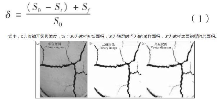 (3)將二值化后的圖轉(zhuǎn)換為矢量圖(圖1c),用CAD(管理軟件計(jì)算機(jī)輔助設(shè)計(jì))面積提取命令得到試驗(yàn)收縮和開(kāi)裂面積,計(jì)算得到試驗(yàn)的收縮開(kāi)裂裂隙度: