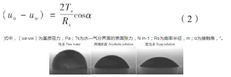 由上式可以看出,基質吸力的大小與表面張力、接觸角和曲率半徑有關。其中,基質吸力的大小與表面張力成正比,與彎液面曲率半徑成反比。因此,表面張力和曲率半徑的變化均會導致基質吸力的改變。在環境溫度為25℃時,通過JC2000型接觸角測量儀對三種試樣的孔隙液體進行接觸角測量。得到三種不同表面張力液滴的幾何形態圖如圖4所示,測量可得純水、酒精溶液和肥皂水對應的接觸角分別為85°、65°和42°,而在25℃環境下,純水、20%酒精溶液、2 g L-1肥皂水的表面張力系數分別為:7.1×10-2N m-1、4.1×10-2N m-1、2.9×10-2N m-1。表面張力是決定彎液面形狀的主要因素之一,會影響曲率半徑和接觸角的大小。很顯然,表面張力大的液體接觸角變大,曲率半徑變小。圖4中水滴表面張力大于酒精溶液,但形成的彎液面半徑卻要小于酒精溶液,同樣的,酒精溶液形成的彎液面半徑又小于肥皂水。曲率半徑越小,土體中的基質吸力越大。孔隙水表面張力會對彎液面的曲率半徑產生改變從而對基質吸力產生影響,最終影響土壤的收縮開裂。