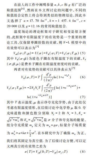 本文具體采用的模型是具有夸克禁閉性質的Friedberg-Lee模型(F-L Model)。F-L模型最初用于描述低能時強子的行為,將強子看做真空中的袋狀孤子解,為QCD理論中的禁閉行為提供了非常直觀的物理解釋。不僅如此,該模型也被擴展至有限溫度密度下夸克物質的退禁閉相變的研究,提供了研究夸克強子相變性質的有利手段。但是該模型只能給出有限溫度密度下夸克物質一級相變的結果,無法討論平滑過渡(Crossover)相變和相臨界截點相關的物理問題,具有一定局限性。不過本文主要研究夸克強子一級相變下氣泡或液滴的動力學問題,F-L模型是比較合適的模型。