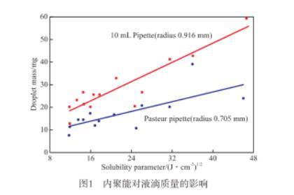 對(duì)于純物質(zhì)的溶解度參數(shù)可通過文獻(xiàn)查閱、基團(tuán)貢獻(xiàn)計(jì)算法和液體熱力學(xué)關(guān)系式計(jì)算。而礦物油為混合物,很難查到或者估算它的溶解度參數(shù)。文獻(xiàn)提供了一種溶解度參數(shù)的估算法:稱量10~20滴液體,然后計(jì)算每滴液體的平均質(zhì)量;另取2種已知溶解度參數(shù)的非揮發(fā)性液體作為參照,通過做圖大致計(jì)算出液體的溶解度參數(shù)。實(shí)驗(yàn)需保持恒溫。分別通過內(nèi)徑為0.916 mm的10 mL移液管和內(nèi)徑為0.705 mm的巴斯德移液管移取液滴,得到兩條溶解度參數(shù)與液滴質(zhì)量的關(guān)系曲線。內(nèi)聚能對(duì)液滴質(zhì)量的影響見圖1。由圖1可見,液滴的質(zhì)量與液體溶解度參數(shù)成線性關(guān)系。該估算方法可用來計(jì)算混合液體的溶解度參數(shù),適用于礦物潤(rùn)滑油溶解度參數(shù)的計(jì)算。雖然估算方法過于粗糙,但為估算礦物油等復(fù)雜混合物的溶解度參數(shù)提供了思路。文獻(xiàn)介紹了液滴的大小與液體表面張力有關(guān)。由此可見,溶解度參數(shù)與表面張力存在一定的關(guān)系。
