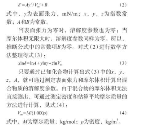 只要通過已知化合物計(jì)算出式(3)中的x,y,z,A,就可通過測(cè)定表面張力和摩爾體積計(jì)算出混合物質(zhì)的溶解度參數(shù)。由于混合物的摩爾體積無法直接測(cè)出,可通過測(cè)定密度和估算平均摩爾質(zhì)量的方法進(jìn)行計(jì)算,見式(4):
