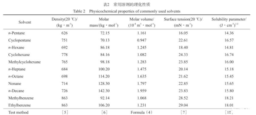 通過表面張力估算法測(cè)定低芳淺色礦物油的溶解度參數(shù)。以溶解度參數(shù)定義為基礎(chǔ),結(jié)合溶解度參數(shù)實(shí)驗(yàn)經(jīng)驗(yàn)公式和表面張力與液滴大小的關(guān)系,推導(dǎo)出表面張力與溶解度參數(shù)的擬合關(guān)系式。通過與11種含弱極性鍵的有機(jī)溶劑溶解度參數(shù)的文獻(xiàn)值進(jìn)行對(duì)比計(jì)算,得到溶解度參數(shù)的表面張力表達(dá)式的各個(gè)系數(shù)。利用溶解度參數(shù)表面張力表達(dá)式,計(jì)算29種常見的低芳淺色礦物油的溶解度參數(shù)。計(jì)算結(jié)果表明,29種低芳淺色礦物油的溶解度參數(shù)計(jì)算值為14.40~16.07(J/cm3)1/2,經(jīng)與文獻(xiàn)值對(duì)比證明了擬合公式的準(zhǔn)確性。