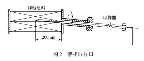 全塔共設有4個取樣口。1#取樣口設在塔頂回流處;2#取樣口設在距填料底部1200mm處;3#取樣口設在距填料底部400mm處;4#取樣口設在填料段以下。填料段的取樣口,即2#、3#取樣口的樣式如圖2所示。取樣器沿水平方向向上傾斜3°放置,伸入填料段的部分為半圓管,長度為200mm,直徑為10mm。這樣設計以保證液相樣品順利地由填料中取出,且取出的液相樣品具有代表性。