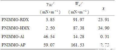 表3PNIMMO與推進(jìn)劑組分的界面張力、界面黏附功及二者比值χ