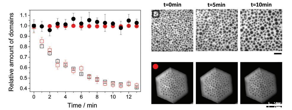 圖 5 帶電(圓形)和中性(方形)雙層(紅色)或單層(黑色)的域相對數(shù)量與時間的關系。 這些圖像是一個例子 中性單層(上)和帶電(下)雙層在指定時間。 圖像中包含的符號對應于圖像中的相同符號 形象的。 比例尺對應于 50 毫米。