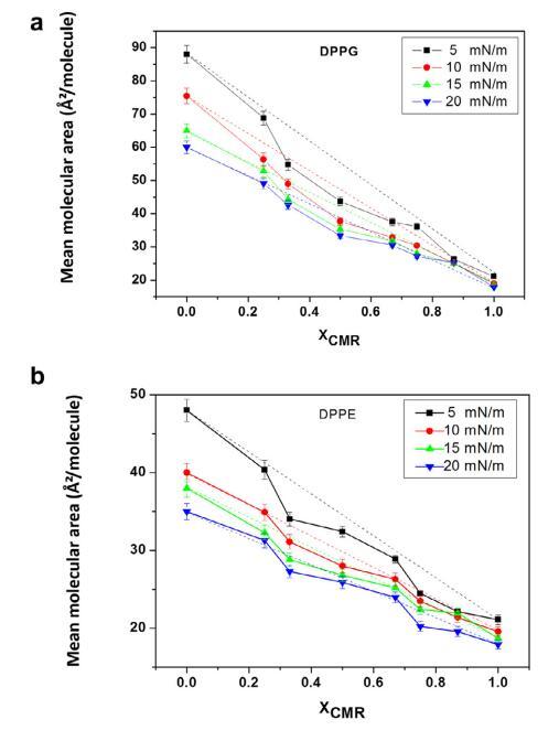 分子面積作為 CMR/ DPPG如圖5a所示。 可以看出負偏差 mma (XCMR = 0.33–0.67) 由于分子吸引力相互作用的增加。 CMR/DPPG 薄膜被認為是部分混溶和非理想的浮動單層,因為線性度不高 觀察到的。 CMR/DPPE 混合薄膜的結果在 XCMR=0.25 和 0.67 時表現出不同的斷裂點(圖 5b)。 DAE 節目 包裝效率甚至幾何形狀的改進 調節發生在較低的 XCMR(圖 6)(Andrade 等人, 2006; 周和張,2000)。