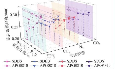 對比相同質量分數下不同氣體注入時表面活性劑泡沫液膜厚度進行分析。注入空氣情況下,溶液質量分數0.15%時,APG0810溶液在泡沫液膜最大,約為0.315 mm,注入甲烷泡沫液膜厚度比空氣低0.006 mm,SDBS溶液泡沫液膜厚度為0.297 mm,注入甲烷泡沫液膜厚度比空氣低0.004 mm,這是由于甲烷氣體密度低于空氣,擴散速率比空氣快。APG0810和SDBS溶液在二氧化碳注入時比空氣分別低0.002 mm和0.004 mm。這是由于二氧化碳氣體為酸性氣體,離子型表面活性劑溶液在酸性環境不易形成泡沫液膜結構,非離子表面活性劑溶液則不易受酸堿度干擾。