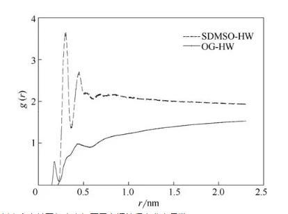 在OPES結(jié)構(gòu)中,有兩個(gè)親水基團(tuán)分別為氧乙烯基(OG)、磺酸基(SDMSO),本文通過徑向分布函數(shù)(通常指的是給定某個(gè)粒子的坐標(biāo),其他粒子在空間的分布概率)來對(duì)比兩者與水之間的作用力。圖5為表面活性劑中氧乙烯基和磺酸基與水分子中氫原子的徑向分布函數(shù)、。由圖可知,(r)曲線第1個(gè)峰值出現(xiàn)在0.306處,這表明磺酸基中的氧原子與水g中的氫原子之間較強(qiáng)的氫鍵作用形成了第1水層;在距離為0.458時(shí),出現(xiàn)第2個(gè)峰值,數(shù)值有所下降,這表示逐漸減小的氫鍵作用形成了第2水層;第3水層形成在0.688處,此時(shí)磺酸基與水的作用進(jìn)一步減弱,但3處的峰值均遠(yuǎn)大于氧乙烯基的峰值。這表明磺酸基與水分子的作用力遠(yuǎn)高于氧乙烯基,所以磺酸基為辛基酚聚氧乙烯醚磺酸鹽結(jié)構(gòu)中的主要親水基團(tuán)。