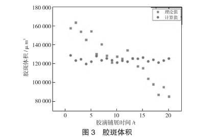 在液橋斷裂后,轉移到點膠面上的膠液在自身表面張力的作用下形成圓潤的膠斑,在理想狀態下膠斑可視為球冠狀,其體積可用球冠狀公式求得。實驗主要使用的膠液為甲基硅油,其表面張力只有21 mN/m,低于環氧樹脂,在基板上由甲基硅油形成的膠斑在穩定狀態下與環氧樹脂的形狀不同,因此不能將其視為球冠狀,需要其他計算體積的方法。為了提高計算的準確性通過灰度處理、二值化等圖像處理的方法提取膠斑的輪廓信息,之后通過提取到的坐標信息來擬合膠斑輪廓的函數,使用旋轉積分的方法來計算膠斑的體積。之后為了驗證計算的準確性,在其他物性條件相同時,將5 000 cps的甲基硅油、3 mm/s的移液針抬升速度的實驗條件下膠斑的鋪展過程作為研究對象。用顯微鏡錄制在液橋斷裂后膠斑的鋪展情況,以0.016 s為間隔,截取20張膠斑的圖片分別用公式和積分法進行膠斑體積的計算,結果如圖3所示。