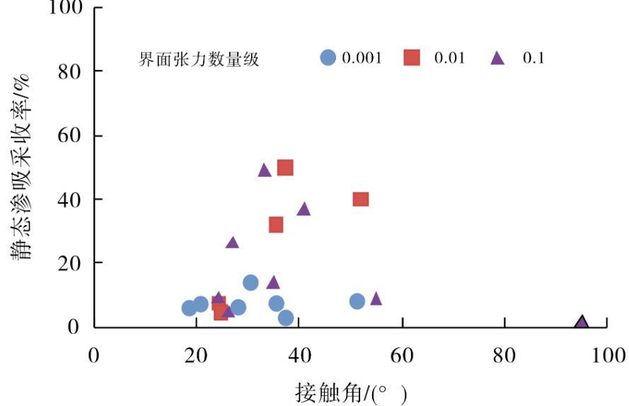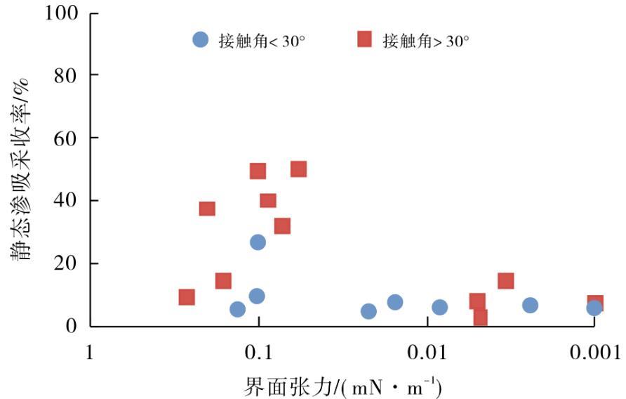 從圖1可知,界面張力大于0.01 mN·m-1時,高接觸角時反而滲吸采收率整體更高。當接觸角小于30°時,靜態(tài)滲吸采收率最高為26.67%,平均為10.66%;當接觸角大于30°時,靜態(tài)滲吸采收率最高為50%,平均為33.15%。從圖2、表1可知,當接觸角大于30°時,滲吸液的界面張力平均為0.096 mN·m-1;當接觸角小于30°時,界面張力則減小到0.043 mN·m-1,這是由于低的接觸角需要更高的表面活性劑濃度(接觸角小于30°時,表面活性劑濃度平均為0.259%;接觸角大于30°時,表面活性劑濃度平均為0.190%),從而導致界面張力降低。因此,化學滲吸時若使用表面活性劑類潤濕劑,應使用合適的濃度,避免為了追求低接觸角導致界面張力過小。
