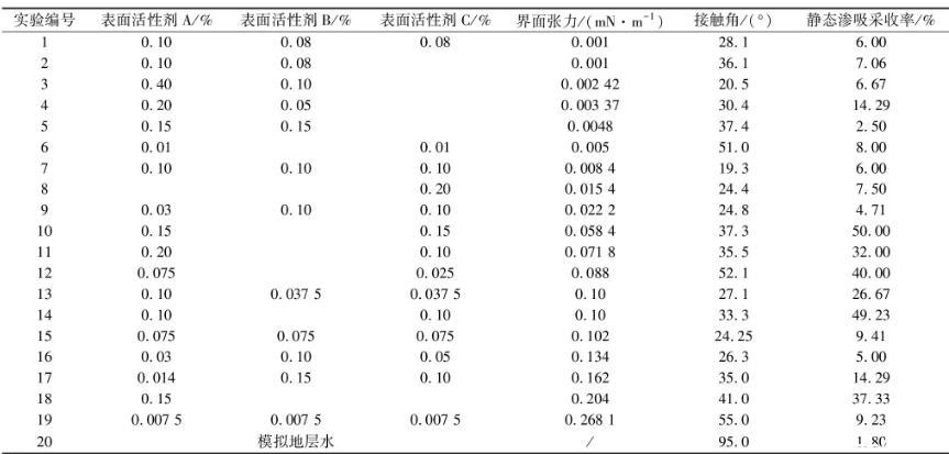 根據(jù)國內外學者的研究,滲吸液對滲吸的影響主要是改變油水界面張力、潤濕性、乳化性和pH值。乳化性主要是通過乳化分散,從而增強油滴在巖心孔道內的流動能力;pH值則主要是影響滲吸液的乳化能力。本次實驗采取靜態(tài)滲吸的方式,乳化性的作用相對較小,故滲吸液配制指標為界面張力與潤濕性。