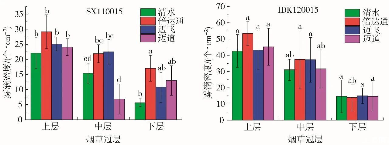 采用IDK120015噴霧時,添加助劑能夠提高藥液霧滴在煙草上、中冠層的霧滴密度。煙草上層,添加倍達通、邁飛和邁道助劑的霧滴密度分別提高25.2%、1.4%和6.1%;中層分別提高20.5%、19.9%和1.9%;下層添加邁飛助劑的霧滴密度提高2.7%,而添加倍達通和邁道助劑則分別降低4.8%和0.2%。在煙草上、中、下冠層的藥液霧滴密度均呈遞減的趨勢,下層霧滴密度分別占上層霧滴密度的26.2%、34.9%和32.4%。