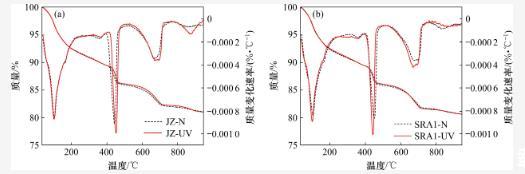 通過TG-DTG程度對比分析60 d齡期時2種環境條件下水泥水化,熱重分析結果圖6和表4所示。化學結合水和氫氧化鈣的含量可以直觀地反映水化速率和水化程度。如表4所示,經過強紫外線照射后,各組樣品的化學結合水含量和氫氧化鈣含量呈下降趨勢,這是因為強紫外線照射下樣品中的自由水會更快地蒸發,最終導致水化程度降低。此外,對比2種環境下的碳酸鈣含量發現,強紫外輻射會促進水泥石的碳化。熱重分析結果與已有的研究結果相似。