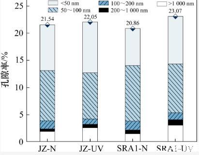 由圖7和表5可以看出:強紫外線輻射使各組樣品的總孔隙率、介孔率(2~50 nm)及大孔率(尤其是200 nm以上的孔)增加,由于彎月面的表面張力效應,介孔的毛細管產生更高的毛細管應力,導致暴露在強紫外輻射環境中的水泥石產生更大的干燥收縮。同時,經過強紫外線照射后,樣品中大于200 nm的孔隙比例增加。這是由于強紫外線輻射環境下,水泥凈漿的水化程度降低及水分散失增加導致的。