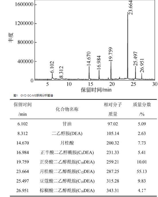 取一定量的GYD,用甲醇作溶劑,將其稀釋至約0.4%的質量分數后,進行GC-MS全掃描分析,得總離子流色譜圖見圖1。用氣相色譜數據處理系統,以峰面積歸一法測得其中各組分的相對質量分數,分析結果見表2。從表2可以看出,GYD是一種組成復雜的烷基醇酰胺混合物,主要包括不同碳數脂肪酸二乙醇酰胺和剩余原料甘油、二乙醇胺、月桂酸等。其中,月桂酸二乙醇酰胺相對含量最高為55.13%。