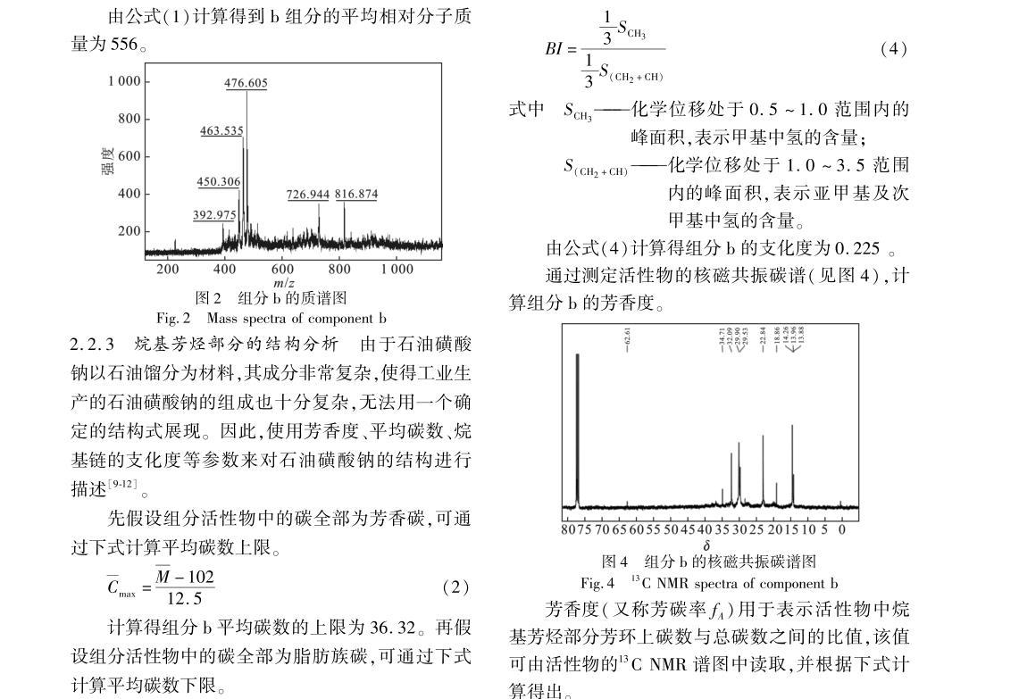 2.2.3烷基芳烴部分的結構分析由于石油磺酸鈉以石油餾分為材料,其成分非常復雜,使得工業生產的石油磺酸鈉的組成也十分復雜,無法用一個確定的結構式展現。因此,使用芳香度、平均碳數、烷基鏈的支化度等參數來對石油磺酸鈉的結構進行描述。