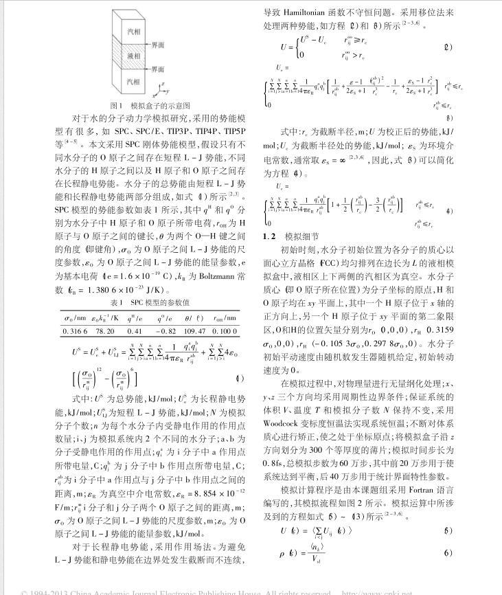 水是許多化學(xué)反應(yīng)過程廉價(jià)的反應(yīng)溶劑,也是化工生產(chǎn)過程常用的工質(zhì)。汽液界面行為是研究水相變傳熱問題的基礎(chǔ)。目前,工程上許多有關(guān)水蒸發(fā)、水蒸氣冷凝、加熱干燥等相變傳熱數(shù)據(jù)仍主要依賴于實(shí)驗(yàn)。隨著分子模擬技術(shù)的發(fā)展,采用分子動力學(xué)模擬方法,從分子水平揭示水汽液界面特性的研究,引起了國內(nèi)外許多學(xué)者的極大關(guān)注。本文擬采用SPC模型,對水汽液界面特性進(jìn)行平衡分子動力學(xué)模擬研究,探討溫度、截?cái)喟霃健⒛M分子數(shù)對水汽液界面特性的影響規(guī)律。
