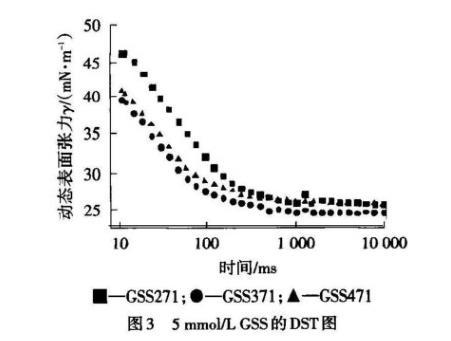 為此,有關連接基的研究較多集中在對靜態性能方面的分析,而對動態性能的研究較少。本實驗對自主研發的乙二醇雙子琥珀酸二仲辛酯磺酸鈉(GSS271)、1,3-丙二醇雙子琥珀酸二仲辛酯磺酸鈉(GSS371)與1,4-丁二醇雙子琥珀酸二仲辛酯磺酸鈉(GSS471)陰離子雙子表面活性劑的DST進行研究,并考察連接基對動態表面性能的影響,探討其吸附動力學機理。