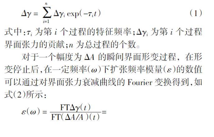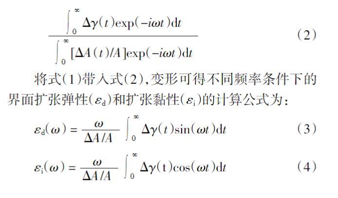 對于一個幅度為ΔA的瞬間界面形變過程,在形變停止后,在一定頻率(ω)下擴(kuò)張頻率模量(ε)的數(shù)值可以通過對界面張力衰減曲線的Fourier變換得到,如式(2)所示: