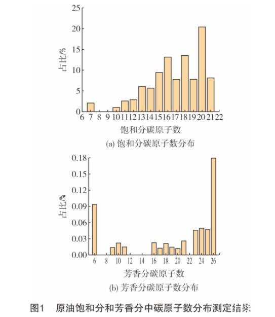 疏水端擴(kuò)散進(jìn)入原油的能力對(duì)表面活性劑在油水界面吸附,降低油水界面張力有直接影響。根據(jù)“相似相溶”原理,表面活性劑疏水端擴(kuò)散進(jìn)入原油的能力和其是否與原油中低極性組分(即飽和分和芳香分)具有相似結(jié)構(gòu)密切相關(guān)。因此,測(cè)定原油中飽和分和芳香分的碳原子數(shù)分布,對(duì)快速篩選驅(qū)油用表面活性劑具有指導(dǎo)意義。
