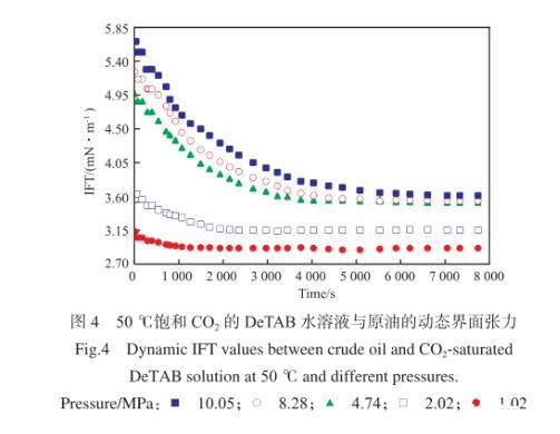圖4為50℃、飽和CO2的DeTAB水溶液與原油的動態界面張力。由圖4可知,在DeTAB水溶液/CO2/原油體系中,初始階段,油水兩相的動態界面張力下降較快,當動態界面張力接近平衡界面張力時,變化趨于平緩,壓力越高界面張力達到穩定所需時間越長。在壓力大于4.7 MPa時,界面張力穩定所需時間在4 500 s以上,遠大于CO2不存在時所需的穩定時間。原因是表面活性劑水溶液中的CO2通過緩慢的擴散作用溶解到原油中,造成油水兩相動態界面張力不斷變化。