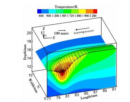 電弧壓力是形成熔池凹陷區(qū)的驅(qū)動力。熔池中心表面的液態(tài)金屬受到較大的壓力,向周圍移動。液態(tài)金屬在熔池中心區(qū)域流速最大,而越靠近熔池底部流速越小。這種流動模式允許更多的熱量從熱源傳遞到熔池底部,從而導致深度滲透。如圖2所示,液態(tài)金屬在電弧壓力的驅(qū)動下被推到熔池的后部,并在凝固時形成冠狀。