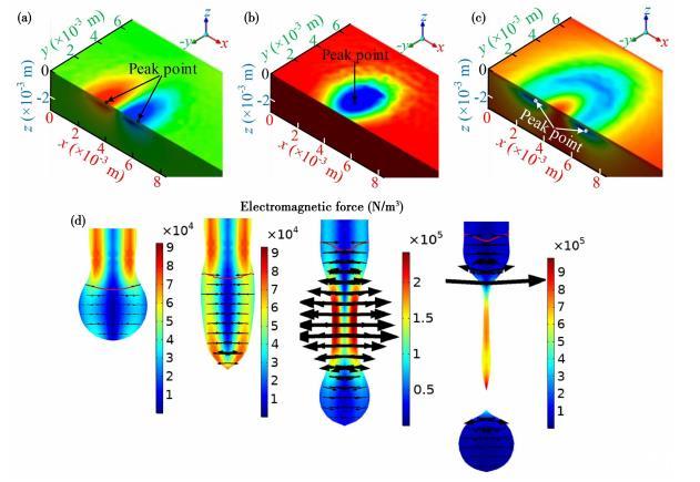 圖1電磁力分布:(a—c)熔池內(nèi)部笛卡爾坐標系x、y、z方向;(d)熔滴內(nèi)部