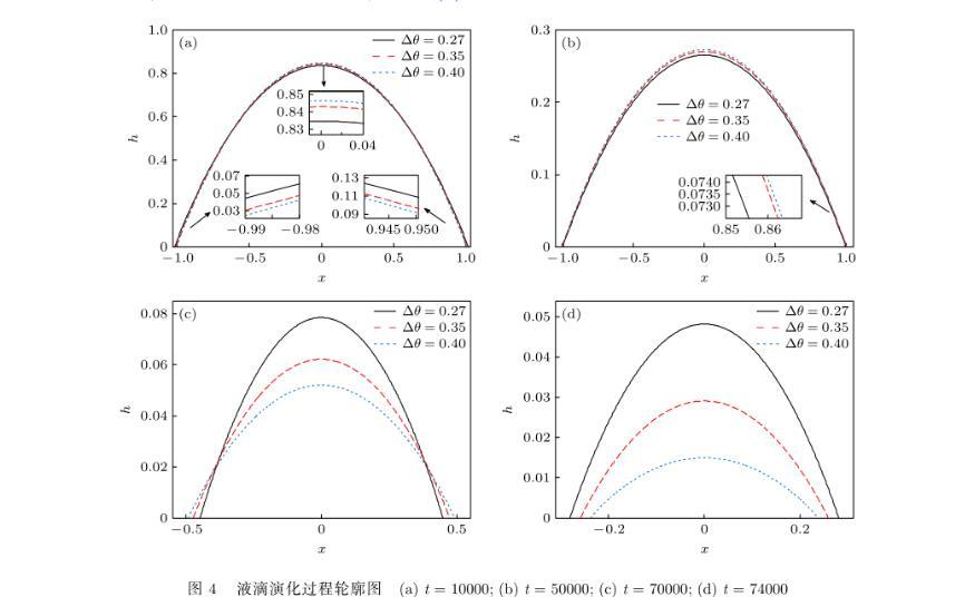 液滴演化過程如圖4所示,由圖4(a)可知,在鋪展階段,隨著遲滯角的增大,液滴鋪展半徑縮小,液滴厚度增大,但因該階段液滴表面溫度較低,蒸發(fā)速率較慢,不同遲滯角下的液滴輪廓差異并不顯著.圖4(b)—圖4(d)表明,在去釘扎階段,當(dāng)遲滯角增大時,液滴收縮速度加快,液滴厚度減小.隨著時間的推移,液滴表面溫度提高,蒸發(fā)速率也不同程度地增大,液滴輪廓逐漸顯出差異;由圖4(d)可知,t=74000時,Δθ=0.27,0.35和0.40下的液滴收縮半徑分別為0.2798,0.2579和0.2352,液滴高度分別為0.04825,0.0291和0.01496,即遲滯角越大,液滴收縮半徑和高度都越小.