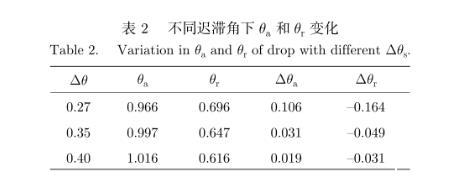 圖5比較了三種遲滯角下動態(tài)接觸角與接觸線移動速度間的對應(yīng)關(guān)系.可以看出,遲滯角對鋪展、釘扎和去釘扎階段等全過程均有不同程度的影響,在釘扎階段,Δθ=0.27下的液滴前進(jìn)接觸角和后退接觸角分別為θa=0.966和θr=0.696,Δθ=0.35和0.40下液滴對應(yīng)于θa=0.997,θr=0.647和θa=1.016,θr=0.616.如表2所列,隨著遲滯角的增大,前進(jìn)接觸角增大,后退接觸角減小,后退接觸角減小的幅度大于前進(jìn)接觸角增大的幅度,這與Karapetsas等的研究結(jié)果一致.因此,可通過改變遲滯角來改變前進(jìn)、后退接觸角,控制接觸線釘扎時間,從而調(diào)控液滴蒸發(fā).