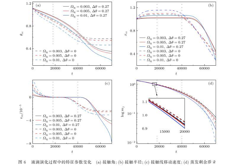 在釘扎階段,三種遲滯角下液滴的接觸線均釘扎在最大接觸半徑處不動,接觸角從前進(jìn)接觸角減小至后退接觸角,Δθ=0.4情形下的液滴接觸角仍高于其他兩種情形下的動態(tài)接觸角,這是受到鋪展階段的接觸角遲滯影響.Bormashenko等通過實(shí)驗發(fā)現(xiàn),水滴在遲滯角度約為50°的鋁表面的蒸發(fā),主要以釘扎方式進(jìn)行.在本文中,釘扎階段的液滴質(zhì)量快速減少(圖3(d)),且Δθ=0.4情形下液滴質(zhì)量減少了0.59,占初始液滴總質(zhì)量的44.36%,高于Δθ=0.27和Δθ=0.35情形的30.83%和39.10%,即增大接觸角遲滯后,釘扎階段的液滴蒸發(fā)在整個液滴演化過程中起重要作用,這一結(jié)果與Bormashenko等的實(shí)驗結(jié)論在定性上一致,且遲滯角越大其影響越明顯.