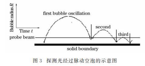 圖3給出了探測光經過脈動空泡的示意圖,圖中空泡脈動特性曲線是基于空泡半徑隨時間變化的數值模擬得到的。圖4即為由探測裝置圖2(a)獲得的對應的典型光偏轉信號波形圖,它包含了激光作用于水中靶材時的三種物理現象和過程,即激光等離子體沖擊波、等離子體空泡及其反彈現象、空泡潰滅沖擊波。圖中峰a為激光等離子體沖擊波;c為等離子體空泡信號;e為空泡反彈信號;f為空泡收縮到最小泡體積時輻射的沖擊波信號;b為空泡膨脹壁;d為空泡收縮壁。
