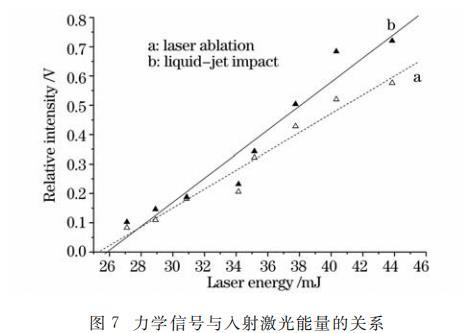 圖7給出了水中力學信號隨入射激光能量變化的關系,其中等離子體燒蝕力和射流沖擊力分別為a和b.由圖可見,隨著激光作用能量的增加,等離子體燒蝕力及射流沖擊力的幅值均呈單調上升趨勢。這是因為入射激光能量越大,激光泡所含能量相應變大,空泡潰滅時所產生的射流速度和射流沖擊力也相應變大。但射流沖擊力b強于等離子體燒蝕力a的關系沒有改變,這說明射流沖擊力是造成靶材被破壞的主要原因。