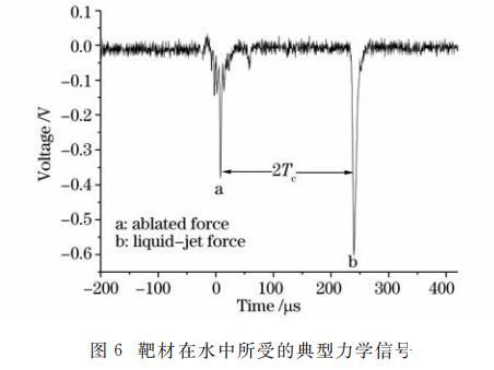 若空泡在固壁面附近潰滅,泡表面的壓力梯度會形成指向靶材的高速液體射流。圖6為由探測裝置圖2(b)獲得的對應單脈沖能量為34mJ時,銅片在激光作用全過程中所受的典型力學信號。圖中可以明顯看到兩個峰的存在,峰a為激光等離子體產生的燒蝕壓力脈沖信號,峰b為射流沖擊力信號。從圖6可以看出,該激光能量作用下,射流沖擊力的強度遠大于等離子體燒蝕力。