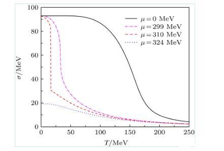 圖1在不同夸克化學勢密度條件下,σ場的真空期望值隨溫度的演化行為